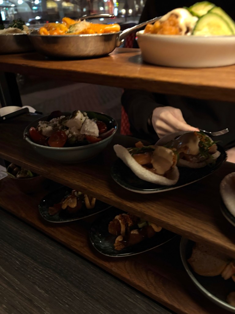 Maten på Pinchos är verkligen god, och jag gillar konceptet med små rätter eftersom man får möjlighet att testa lite av varje. Igår tror jag dessutom att jag hittade en ny favoriträtt, Sushi-style salmon. Det är yuzu-marinerad laxtartar med wakame, sojamajonnäs, sesam på räkchips. Så gott! Det var också väldigt mysigt att bara sitta där och prata.