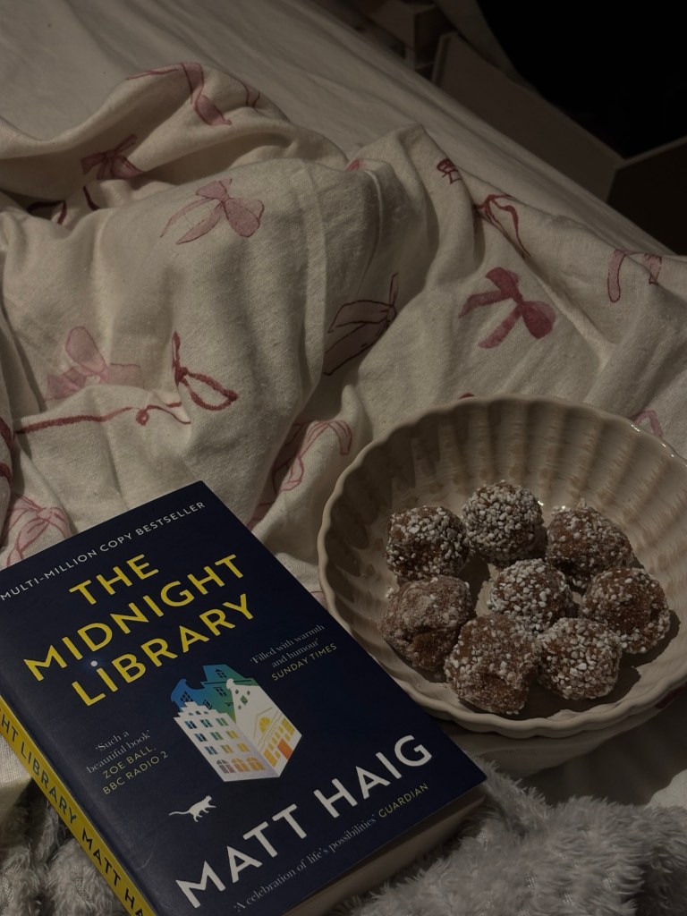 Lite extra mys i sängen med The Midnight Library av Matt Haig och chokladbollar. Jag har hittills läst 118 sidor och ärligt talat tycker jag att den är lite seg och har ett långsam tempo för min smak. Men jag ska försöka ge den en chans. Chokladbollarna blev inte de finaste den här gången. Inte särskilt runda och pärlsockret tog slut, så det fick blev en blandning av strösocker och pärlsocker. Men det viktigaste ör ju att de blev goda.